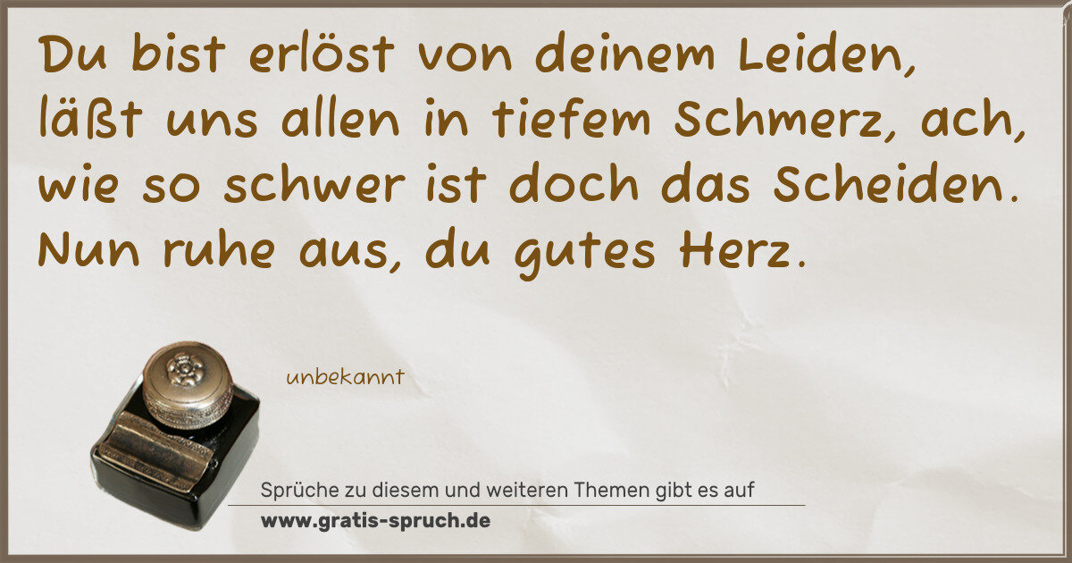 Du bist erlöst von deinem Leiden, läßt uns allen in tiefem Schmerz, ach, wie so schwer ist doch das Scheiden. Nun ruhe aus, du gutes Herz.