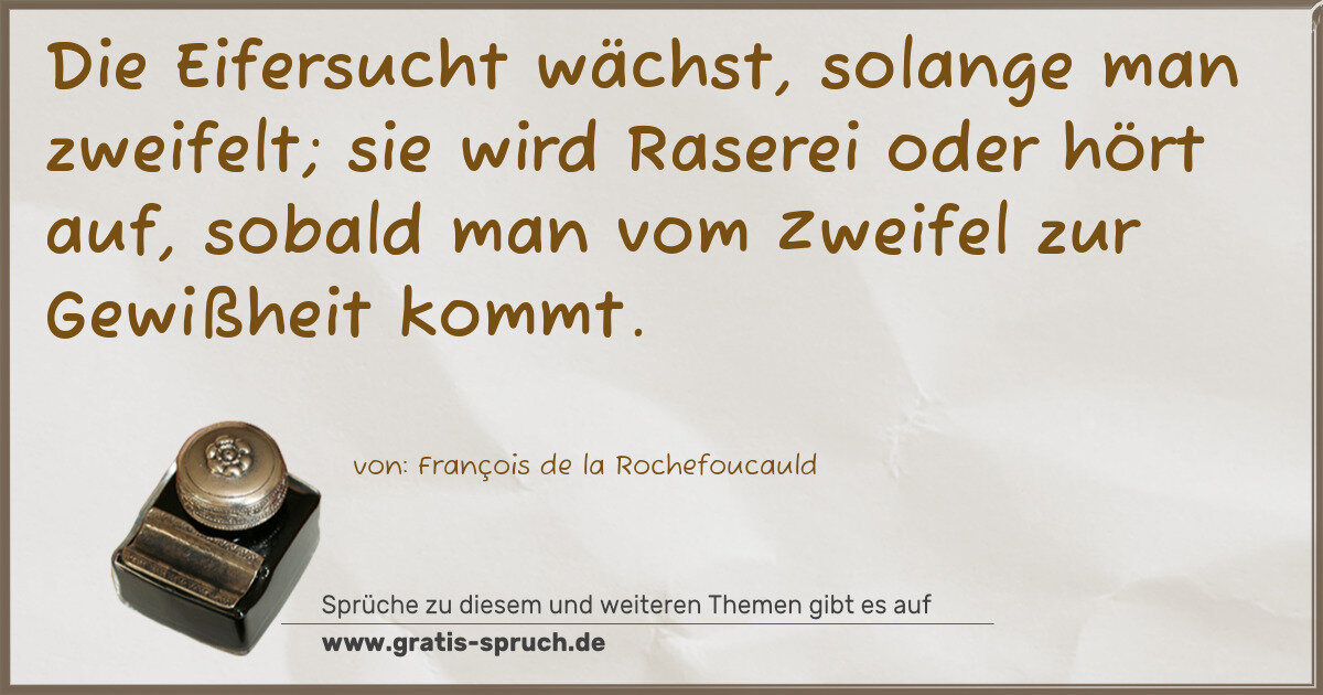 Die Eifersucht wächst, solange man zweifelt; sie wird Raserei oder hört auf, sobald man vom Zweifel zur Gewißheit kommt.