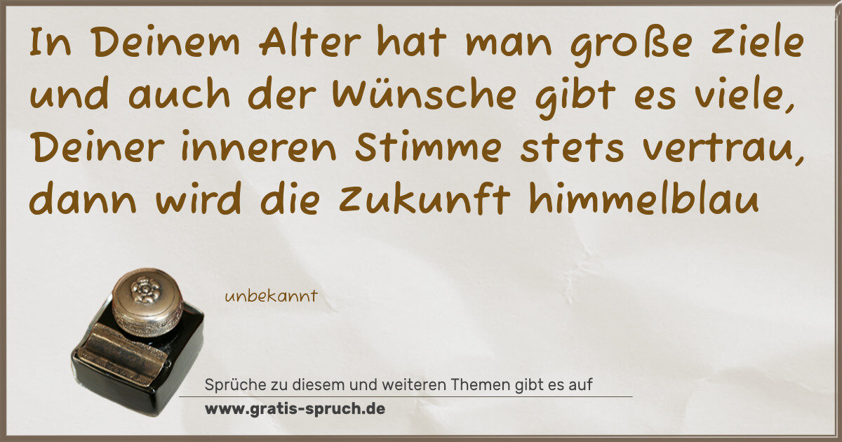 In Deinem Alter hat man große Ziele und auch der Wünsche gibt es viele, Deiner inneren Stimme stets vertrau, dann wird die Zukunft himmelblau