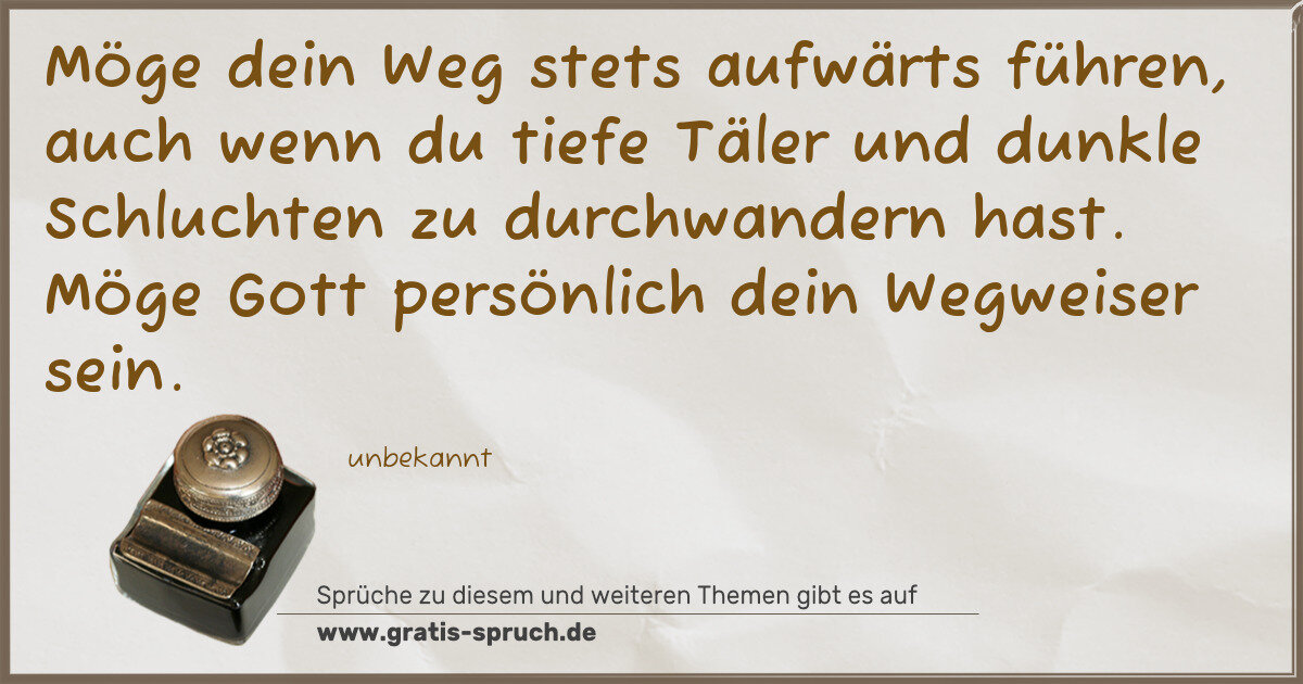 Möge dein Weg stets aufwärts führen, auch wenn du tiefe Täler und dunkle Schluchten zu durchwandern hast. Möge Gott persönlich dein Wegweiser sein.