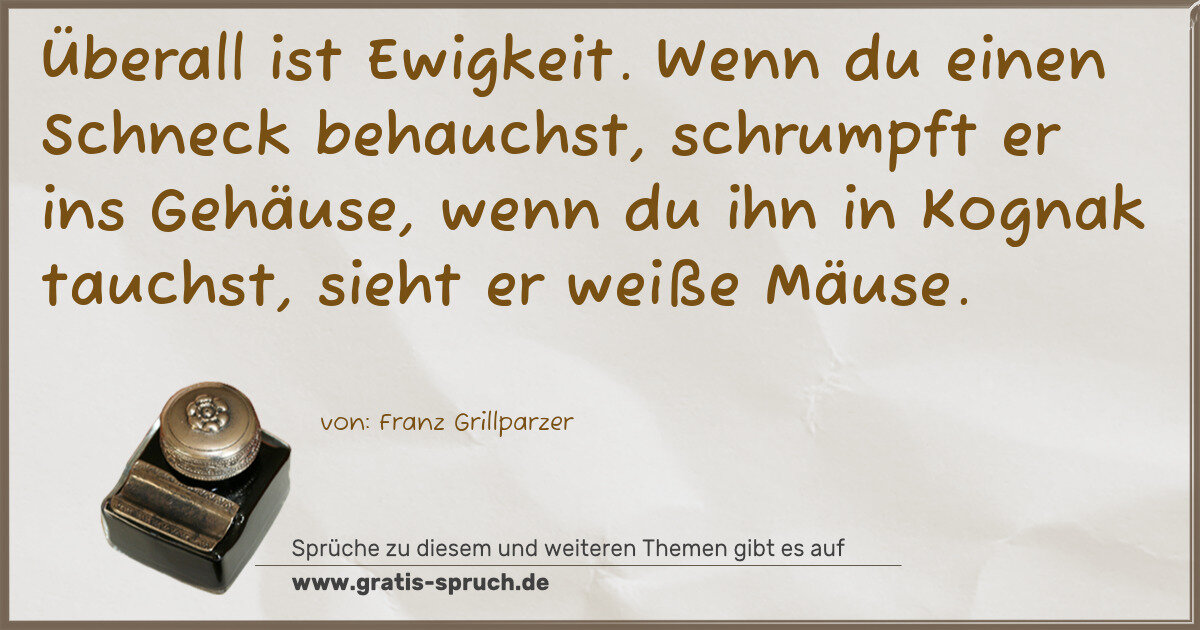 Überall ist Ewigkeit. Wenn du einen Schneck behauchst, schrumpft er ins Gehäuse, wenn du ihn in Kognak tauchst, sieht er weiße Mäuse.