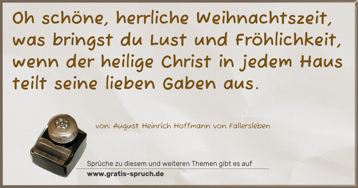 Oh schöne, herrliche Weihnachtszeit, was bringst du Lust und Fröhlichkeit, wenn der heilige Christ in jedem Haus teilt seine lieben Gaben aus.