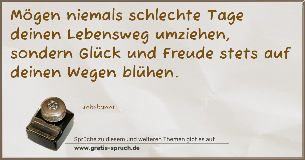 Mögen niemals schlechte Tage deinen Lebensweg umziehen, sondern Glück und Freude stets auf deinen Wegen blühen.
