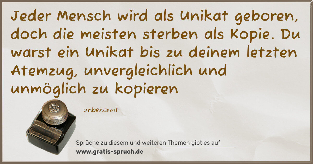 Jeder Mensch wird als Unikat geboren, doch die meisten sterben als Kopie. Du warst ein Unikat bis zu deinem letzten Atemzug, unvergleichlich und unmöglich zu kopieren