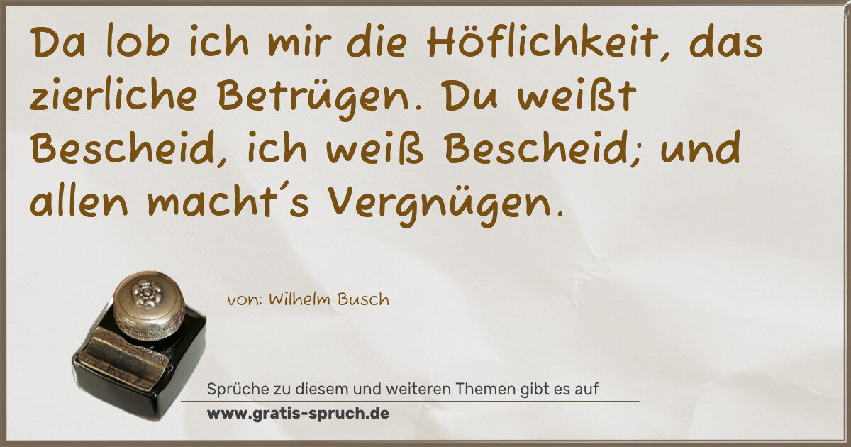 Da lob ich mir die Höflichkeit, das zierliche Betrügen. Du weißt Bescheid, ich weiß Bescheid; und allen macht's Vergnügen.