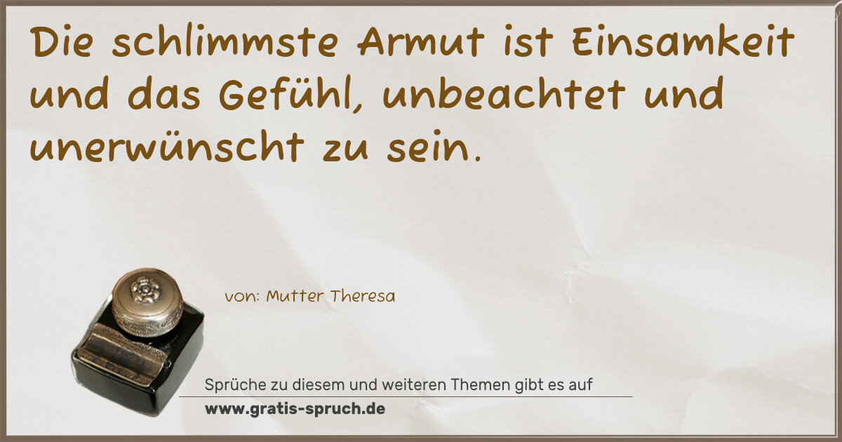 Die schlimmste Armut ist Einsamkeit und das Gefühl, unbeachtet und unerwünscht zu sein.