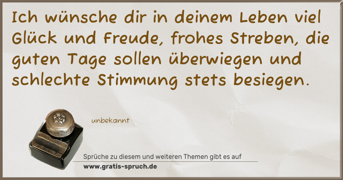 Ich wünsche dir in deinem Leben viel Glück und Freude, frohes Streben, die guten Tage sollen überwiegen und schlechte Stimmung stets besiegen.