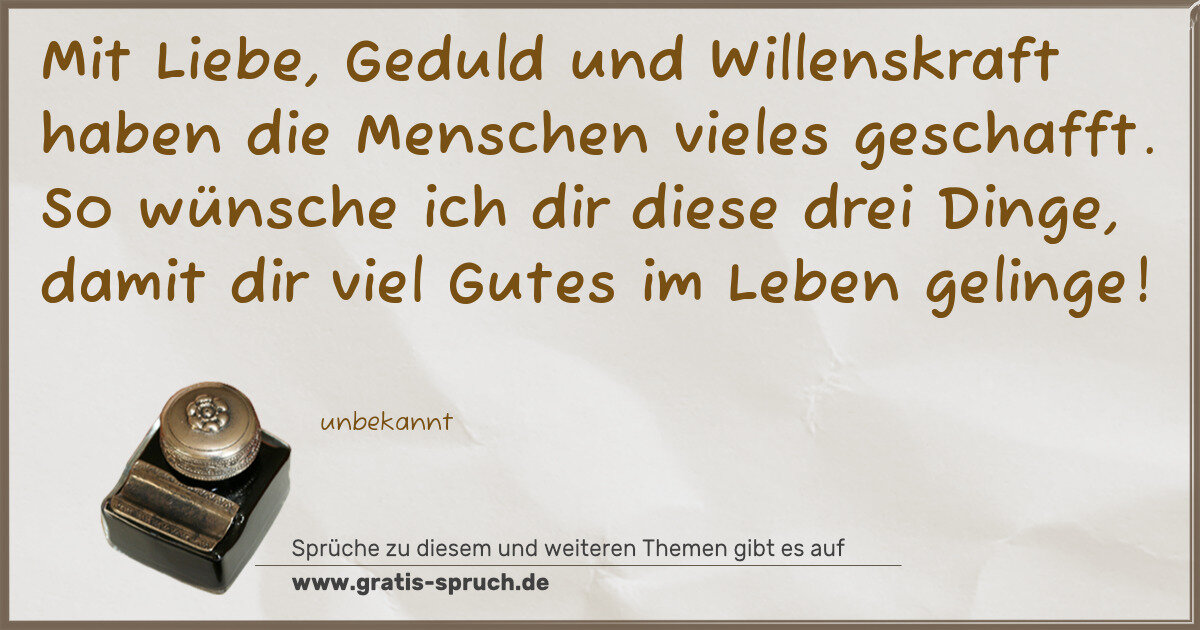 Mit Liebe, Geduld und Willenskraft haben die Menschen vieles geschafft. So wünsche ich dir diese drei Dinge, damit dir viel Gutes im Leben gelinge!