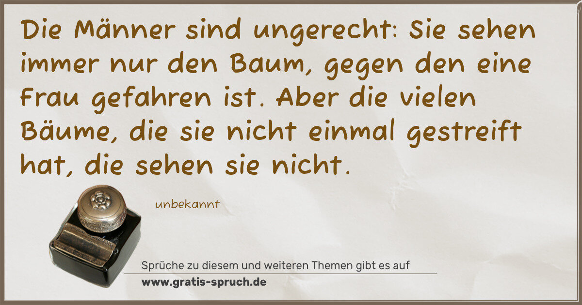 Die Männer sind ungerecht: Sie sehen immer nur den Baum, gegen den eine Frau gefahren ist. Aber die vielen Bäume, die sie nicht einmal gestreift hat, die sehen sie nicht.
