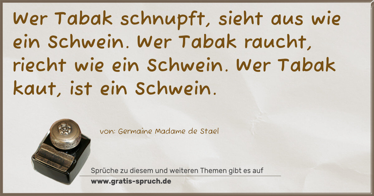 Wer Tabak schnupft, sieht aus wie ein Schwein. Wer Tabak raucht, riecht wie ein Schwein. Wer Tabak kaut, ist ein Schwein.