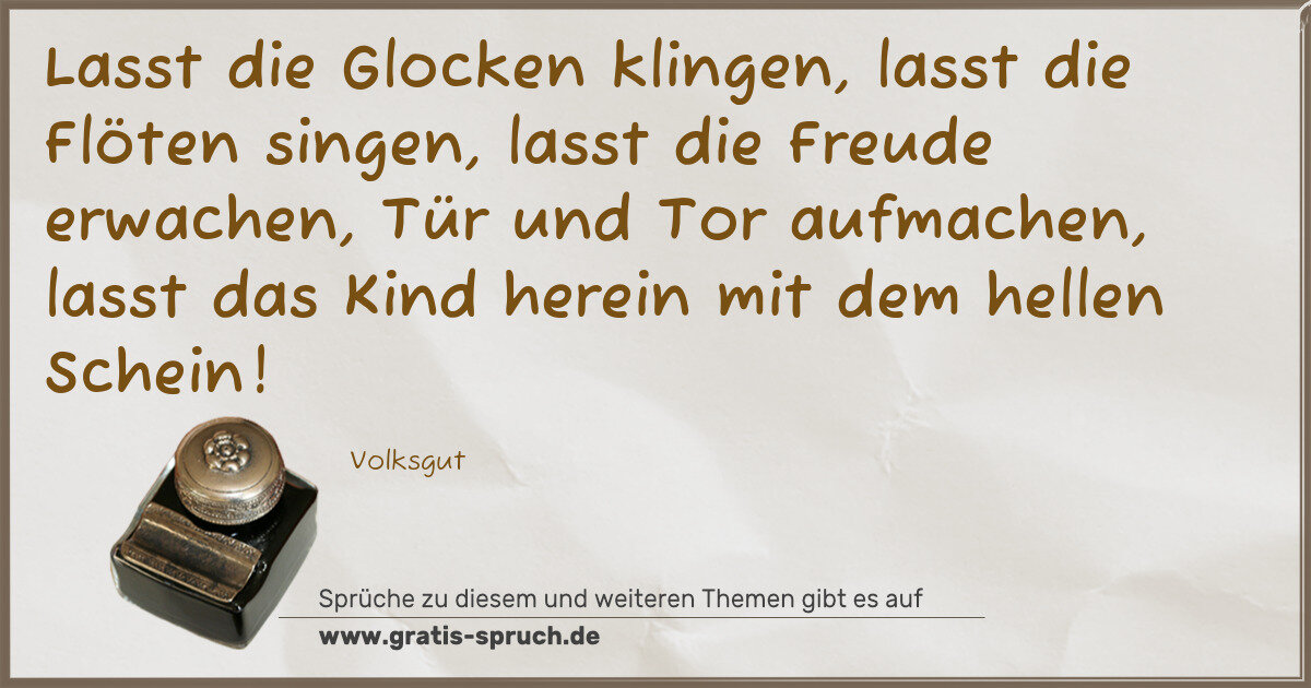 Lasst die Glocken klingen, lasst die Flöten singen, lasst die Freude erwachen, Tür und Tor aufmachen, lasst das Kind herein mit dem hellen Schein!