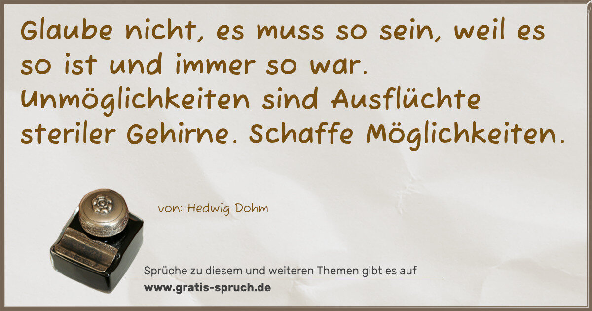 Glaube nicht, es muss so sein, weil es so ist und immer so war. Unmöglichkeiten sind Ausflüchte steriler Gehirne. Schaffe Möglichkeiten.