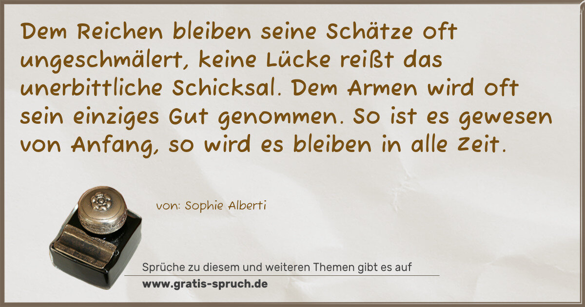 »Dem Reichen bleiben seine Schätze oft ungeschmälert, keine Lücke reißt das unerbittliche Schicksal. Dem Armen wird oft sein einziges Gut genommen. So ist es gewesen von Anfang, so wird es bleiben in alle Zeit.