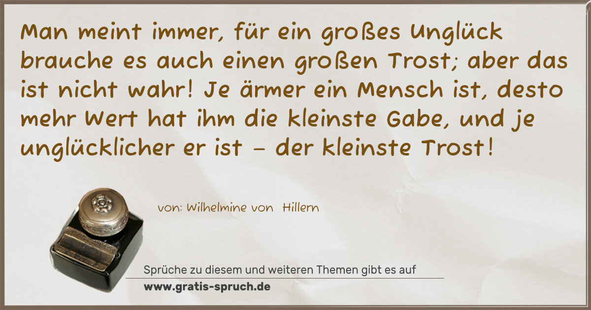 »Man meint immer, für ein großes Unglück brauche es auch einen großen Trost; aber das ist nicht wahr! Je ärmer ein Mensch ist, desto mehr Wert hat ihm die kleinste Gabe, und je unglücklicher er ist – der kleinste Trost!
