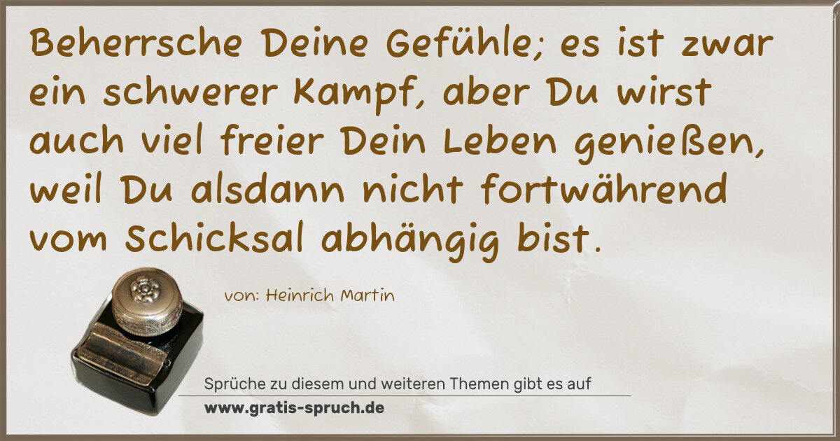 »Beherrsche Deine Gefühle; es ist zwar ein schwerer Kampf, aber Du wirst auch viel freier Dein Leben genießen, weil Du alsdann nicht fortwährend vom Schicksal abhängig bist.