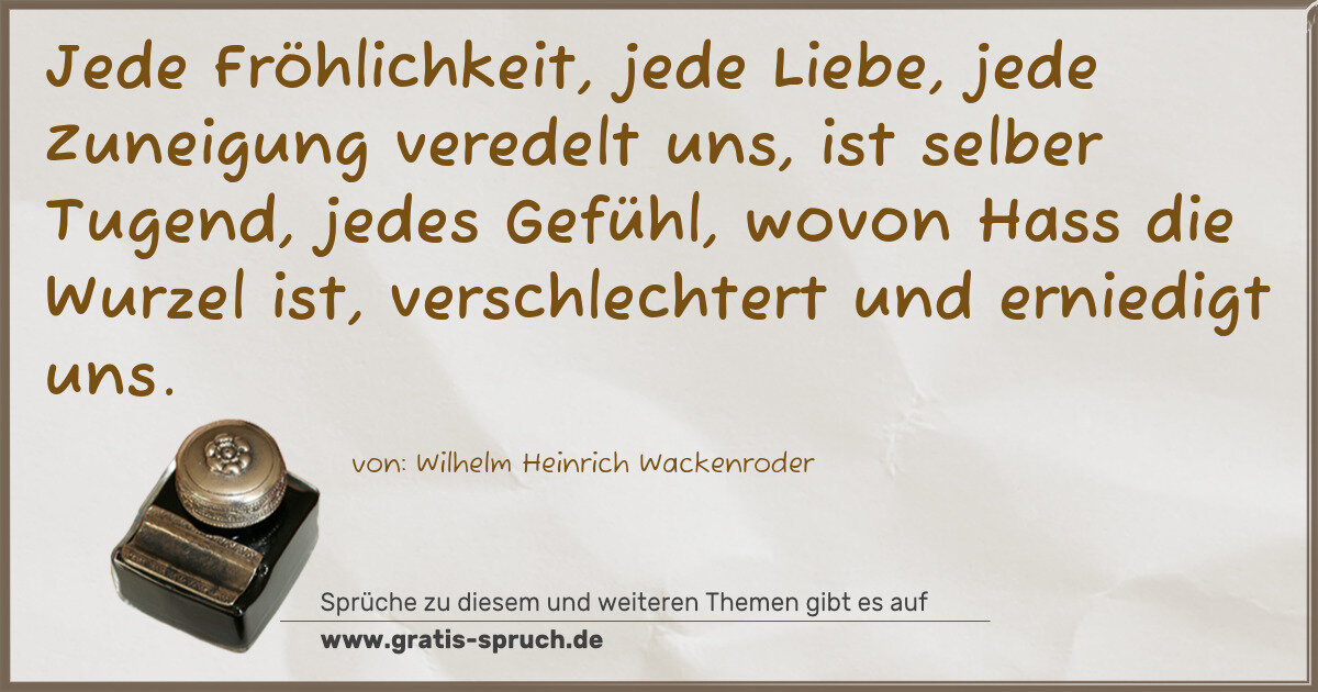 »Jede Fröhlichkeit, jede Liebe, jede Zuneigung veredelt uns, ist selber Tugend, jedes Gefühl, wovon Hass die Wurzel ist, verschlechtert und erniedigt uns.