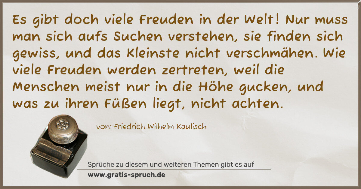 »Es gibt doch viele Freuden in der Welt! Nur muss man sich aufs Suchen verstehen, sie finden sich gewiss, und das Kleinste nicht verschmähen. Wie viele Freuden werden zertreten, weil die Menschen meist nur in die Höhe gucken, und was zu ihren Füßen liegt, nicht achten.