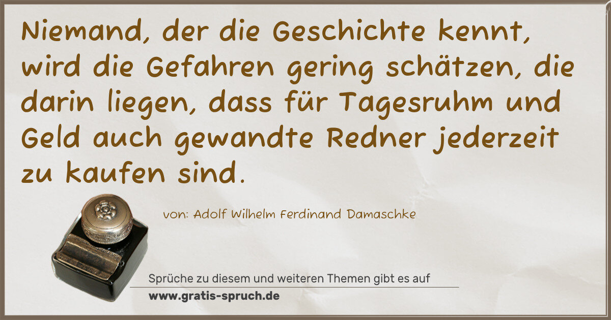 »Niemand, der die Geschichte kennt, wird die Gefahren gering schätzen, die darin liegen, dass für Tagesruhm und Geld auch gewandte Redner jederzeit zu kaufen sind.