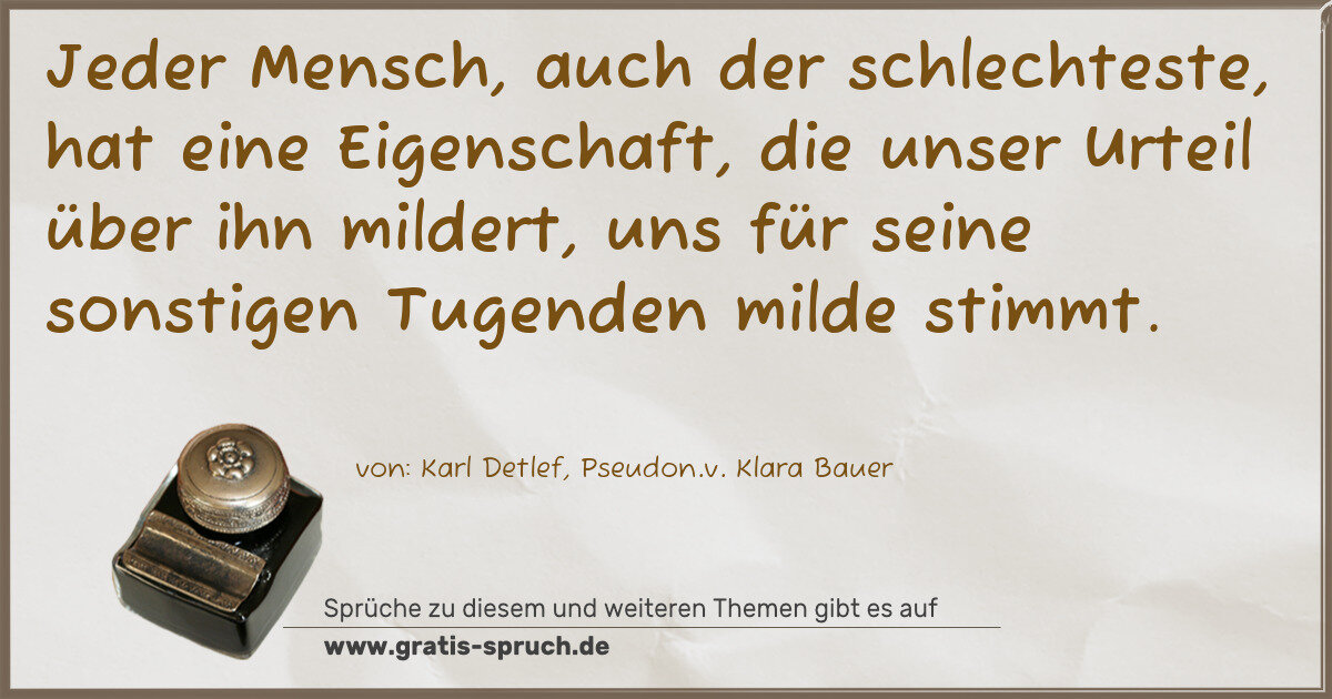 »Jeder Mensch, auch der schlechteste, hat eine Eigenschaft, die unser Urteil über ihn mildert, uns für seine sonstigen Tugenden milde stimmt.