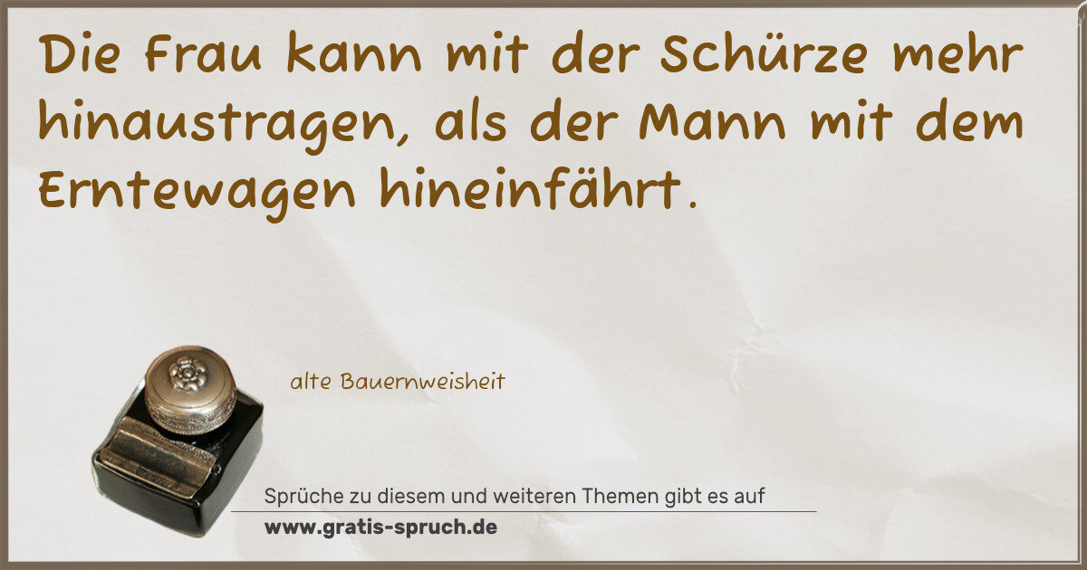 Die Frau kann mit der Schürze mehr hinaustragen, als der Mann mit dem Erntewagen hineinfährt.