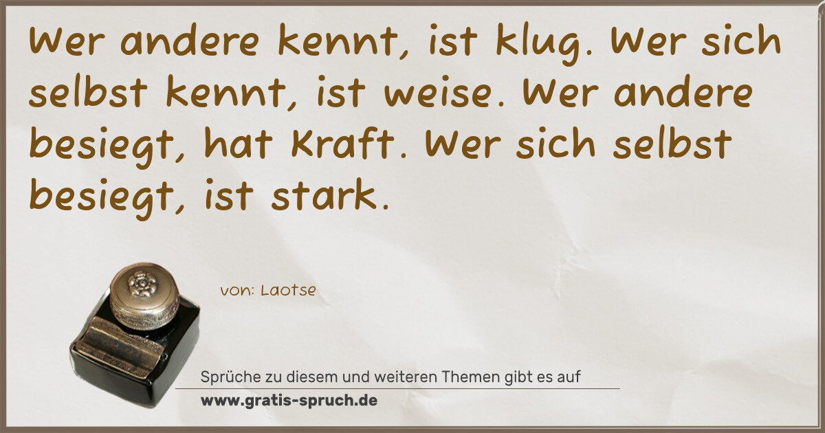 Wer andere kennt, ist klug. Wer sich selbst kennt, ist weise. Wer andere besiegt, hat Kraft. Wer sich selbst besiegt, ist stark.
