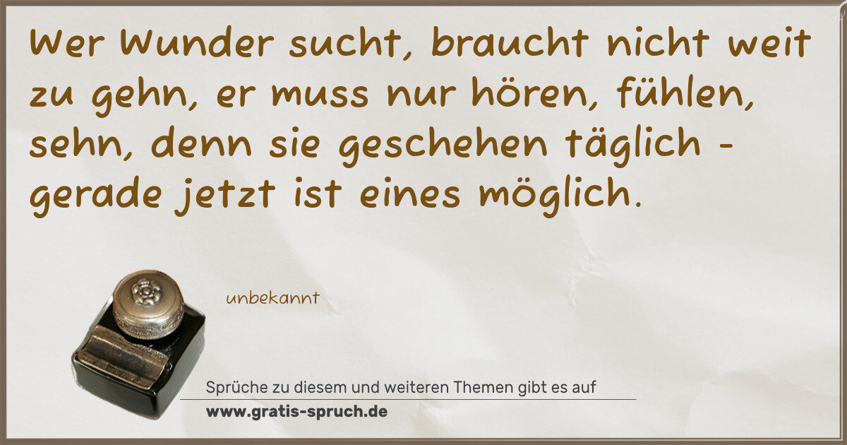 Wer Wunder sucht, braucht nicht weit zu gehn, er muss nur hören, fühlen, sehn, denn sie geschehen täglich - gerade jetzt ist eines möglich.
