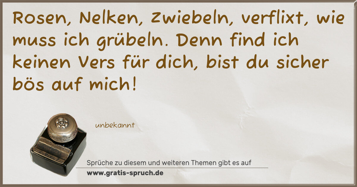 Rosen, Nelken, Zwiebeln, verflixt, wie muss ich grübeln. Denn find ich keinen Vers für dich, bist du sicher bös auf mich!