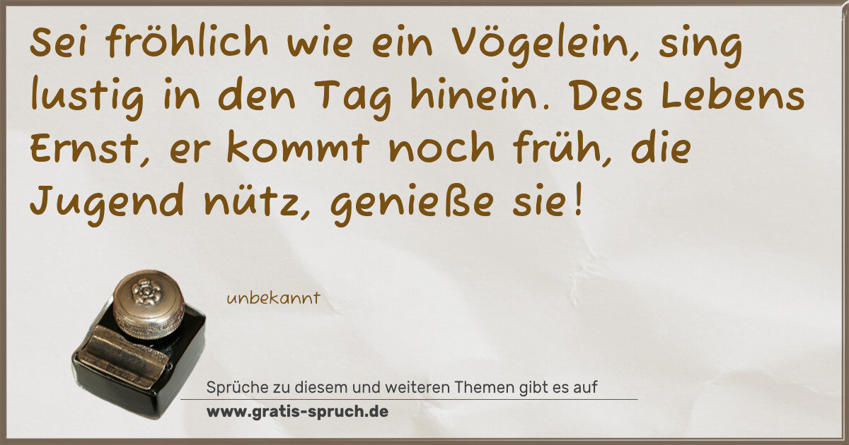 Sei fröhlich wie ein Vögelein, sing lustig in den Tag hinein. Des Lebens Ernst, er kommt noch früh, die Jugend nütz, genieße sie!