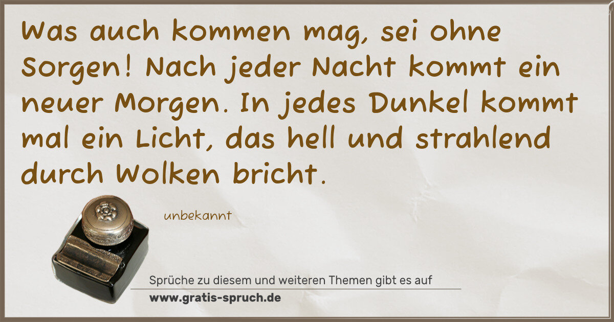 Was auch kommen mag, sei ohne Sorgen! Nach jeder Nacht kommt ein neuer Morgen. In jedes Dunkel kommt mal ein Licht, das hell und strahlend durch Wolken bricht.