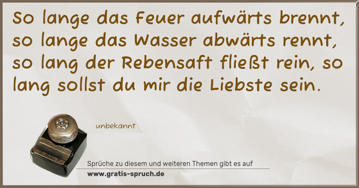 So lange das Feuer aufwärts brennt, so lange das Wasser abwärts rennt, so lang der Rebensaft fließt rein, so lang sollst du mir die Liebste sein.