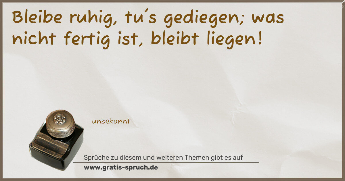 Bleibe ruhig, tu's gediegen; was nicht fertig ist, bleibt liegen!