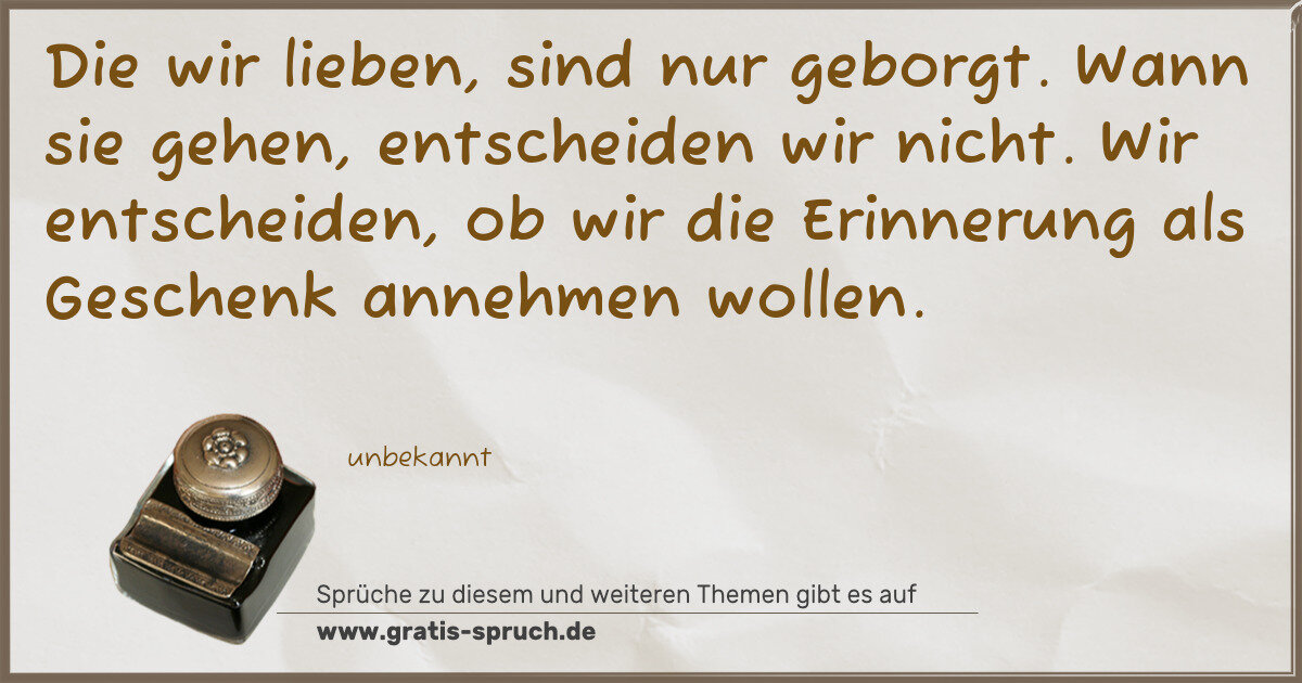 Die wir lieben, sind nur geborgt. Wann sie gehen, entscheiden wir nicht. Wir entscheiden, ob wir die Erinnerung als Geschenk annehmen wollen.