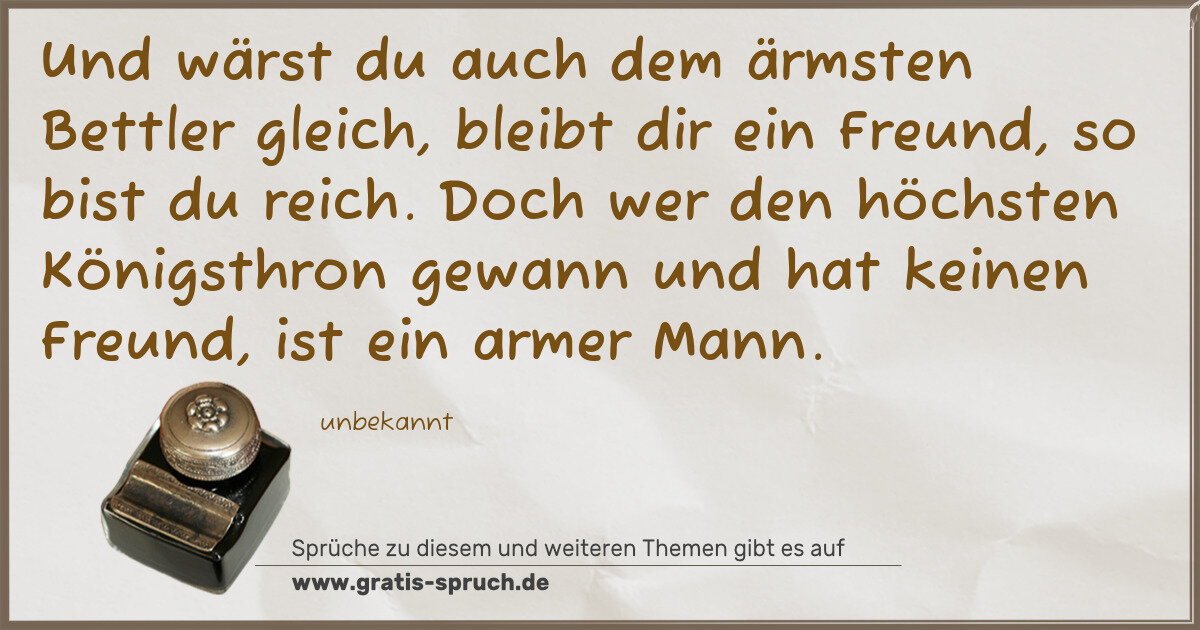 Und wärst du auch dem ärmsten Bettler gleich, bleibt dir ein Freund, so bist du reich. Doch wer den höchsten Königsthron gewann und hat keinen Freund, ist ein armer Mann.