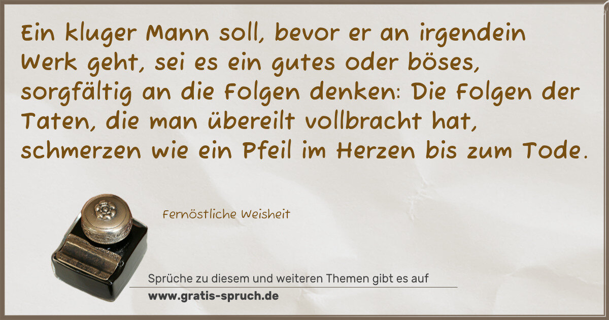 »Ein kluger Mann soll, bevor er an irgendein Werk geht, sei es ein gutes oder böses, sorgfältig an die Folgen denken: Die Folgen der Taten, die man übereilt vollbracht hat, schmerzen wie ein Pfeil im Herzen bis zum Tode.