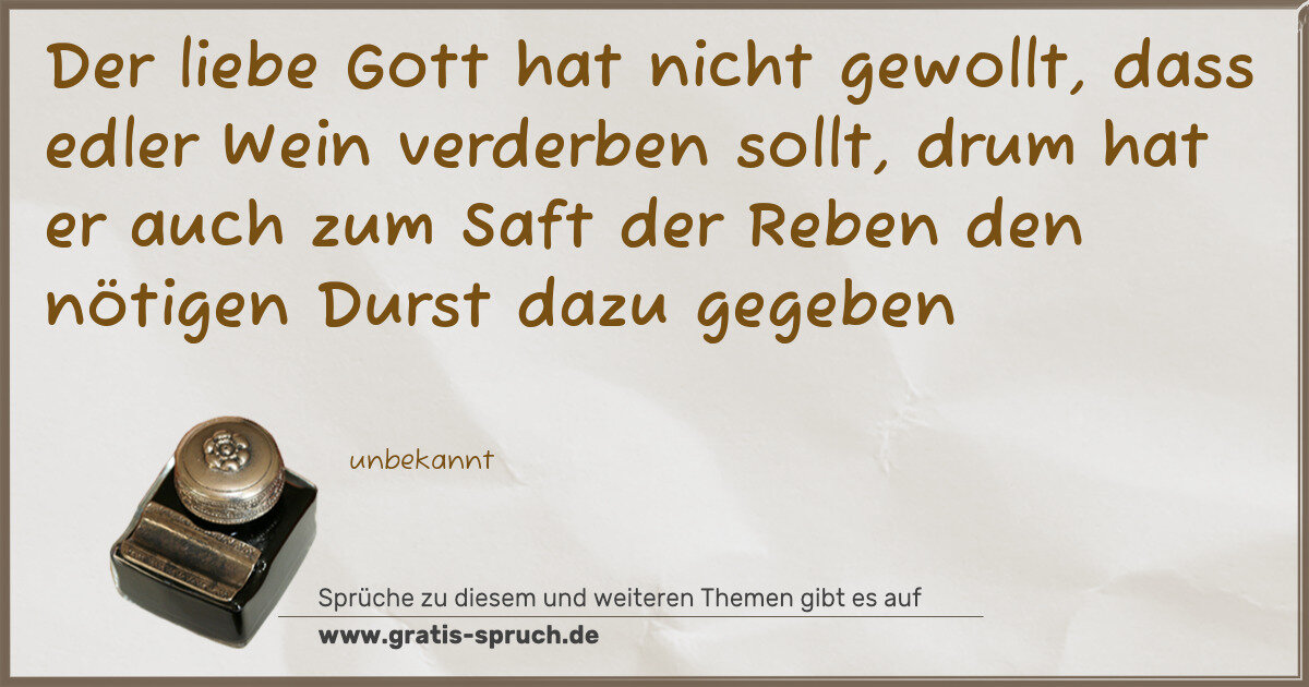Der liebe Gott hat nicht gewollt, dass edler Wein verderben sollt, drum hat er auch zum Saft der Reben den nötigen Durst dazu gegeben