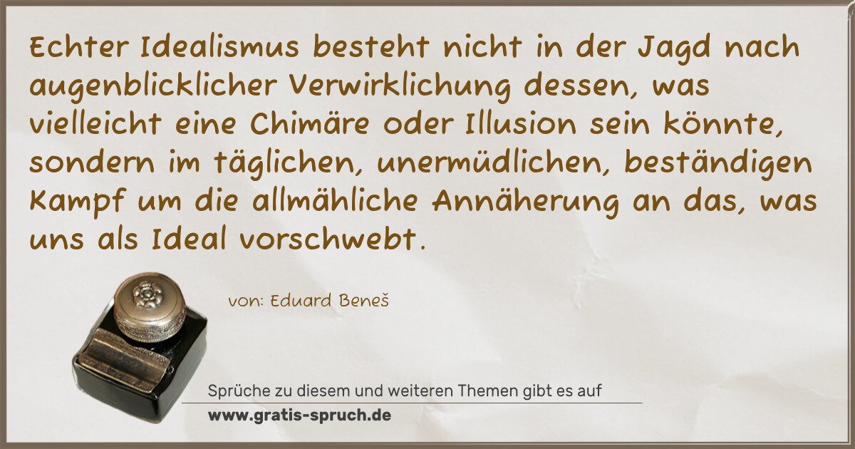 »Echter Idealismus besteht nicht in der Jagd nach augenblicklicher Verwirklichung dessen, was vielleicht eine Chimäre oder Illusion sein könnte, sondern im täglichen, unermüdlichen, beständigen Kampf um die allmähliche Annäherung an das, was uns als Ideal vorschwebt.