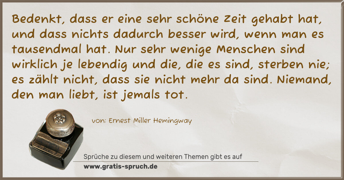 »Bedenkt, dass er eine sehr schöne Zeit gehabt hat, und dass nichts dadurch besser wird, wenn man es tausendmal hat. Nur sehr wenige Menschen sind wirklich je lebendig und die, die es sind, sterben nie; es zählt nicht, dass sie nicht mehr da sind. Niemand, den man liebt, ist jemals tot.