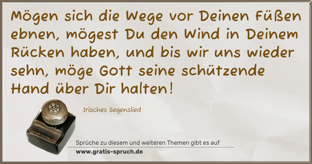 Mögen sich die Wege vor Deinen Füßen ebnen, mögest Du den Wind in Deinem Rücken haben, und bis wir uns wieder sehn, möge Gott seine schützende Hand über Dir halten!