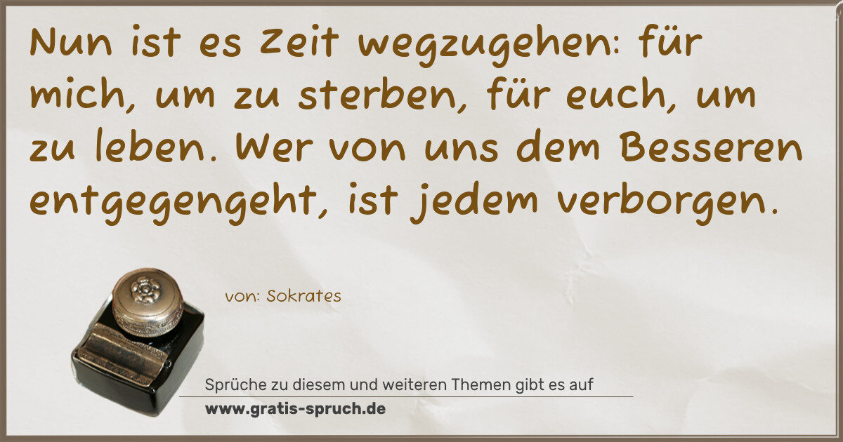 Nun ist es Zeit wegzugehen: für mich, um zu sterben, für euch, um zu leben. Wer von uns dem Besseren entgegengeht, ist jedem verborgen.